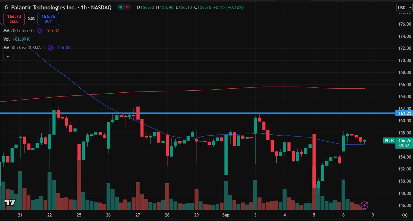 I pointed out that at the time with PLTR trading around $156.75, it might run into some potential resistance right around the $161.25 level. It had turned away several times already at that level. If you were thinking about a bullish trade, I reasoned, be sure to wait until a move through that level, which for me is a 2-bar bullish close (2 consecutive bullish candles in a row over that level).