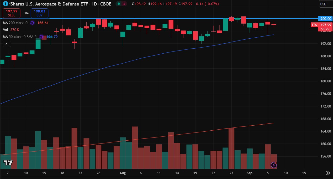 Another one we talked about was the U.S. Aerospace and Defense ETF. (ITA). The ETF had some major potential resistance right around the $200 level, as you can see in the daily chart below. I set up a price alert just above the $200 level so I’ll know if it happens again, and I’ll wait until there is a 2-bar close above that level before considering investing in the ETF.