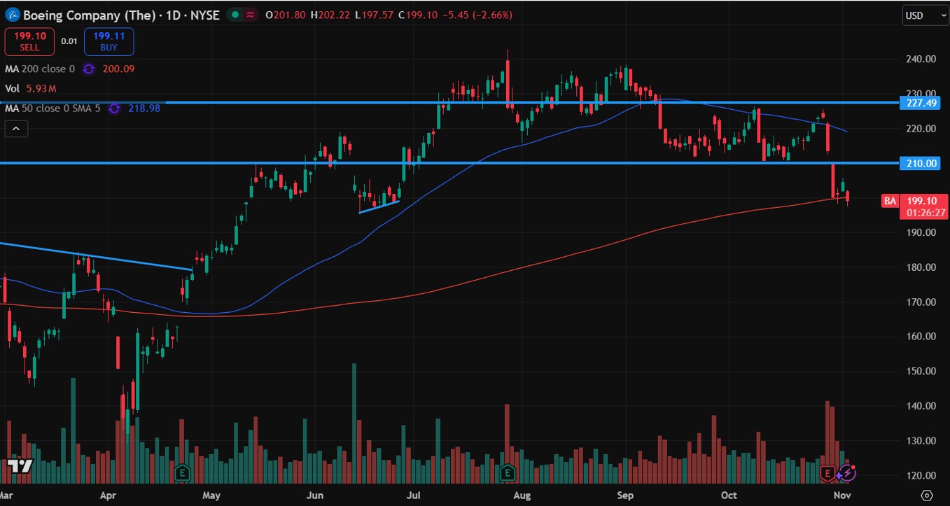 Depending on the spread, the directional calendar will usually have a breakeven that is lower than the bull call spread. The bull call will usually need a move higher, but because of potential positive theta, a call calendar usually has the advantage. Let’s consider a potential scenario on Boeing Co. (BA). Look at the chart below. Let’s pretend an option trader thinks the stock will rally up to $210 by next week’s expiration (Nov 14th).