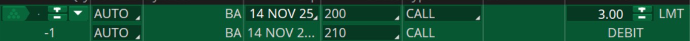 That means he bought the 200 call and sold the 210 call for a debit of 3.00. That is the max risk suffered if BA closes at $200 or lower at expiration. Max profit is 7.00 (10 -3) and is realized if BA is trading at $210 or higher at expiration. Breakeven is $203 (200 + 3) at expiration.