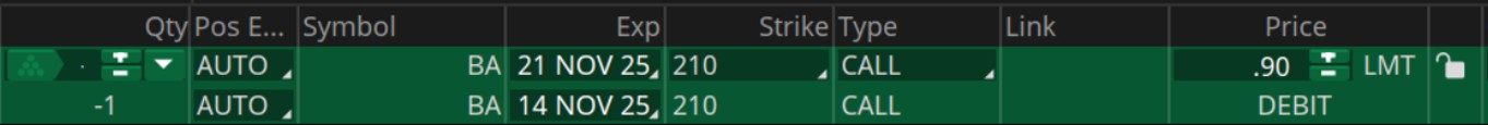 He could also choose to buy a Nov 14th/Nov 21st 210 call calendar as seen below.
