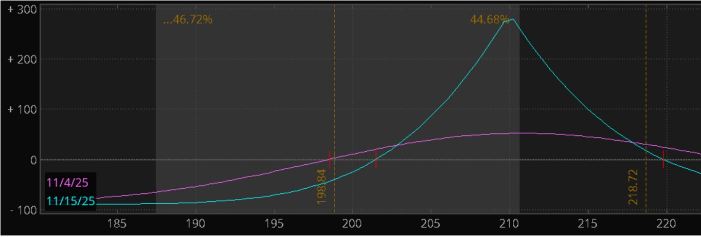 That means he sold the Nov 14th 210 call and bought the Nov 21st 210 call for a debit of 0.90. That is the max risk and is much less than the bull call at 3.00. The max profit and breakevens are not exact and are guesstimates because of 2 different expirations (Nov 14th and Nov 21st). The P&L diagram at the short expiration looks like this (see below).