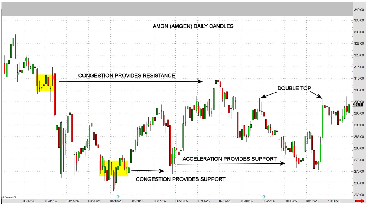 An extreme (top or bottom) is often made when a market tests a previous acceleration point or a gap. Fundamental events frequently lead to a breakout of a congestion phase. Such moves are often violent with an increase in volume. Breakout candlesticks typically have a long body with small to no wicks. The charts below show how old acceleration points become support/resistance when revisited.