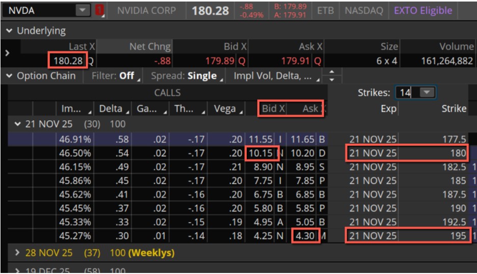 With the stock around $180, she can sell the 180 strike for 10.15 and buy 2 of the 195 strike calls for 4.30 apiece. This gives her a credit of 1.55 (10.15 – (4.30 X 2)) as seen below.