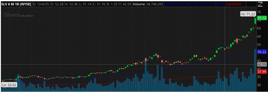 Check out this recent 6-month chart of SLV (iShares Silver Trust). It has easily more than doubled over the past several months. Who wouldn’t love their stock position to do the same?