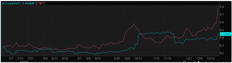 In addition, the implied volatility has shot through the roof. Look below at a screenshot of recent IV/HV levels. As you can see, it is the highest it has been in the past 6 months.
